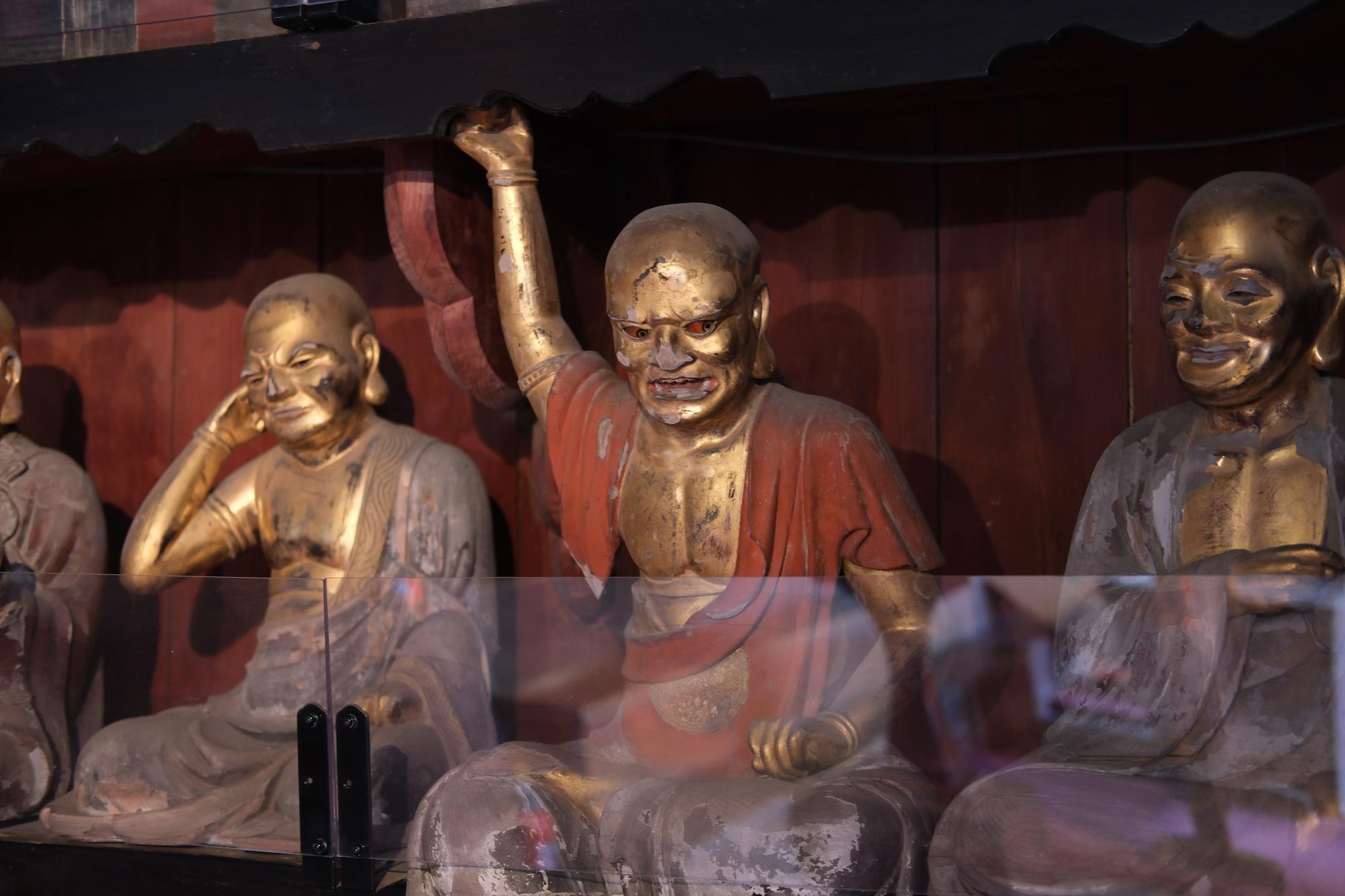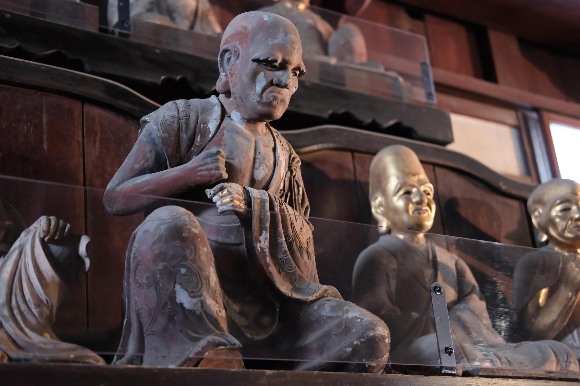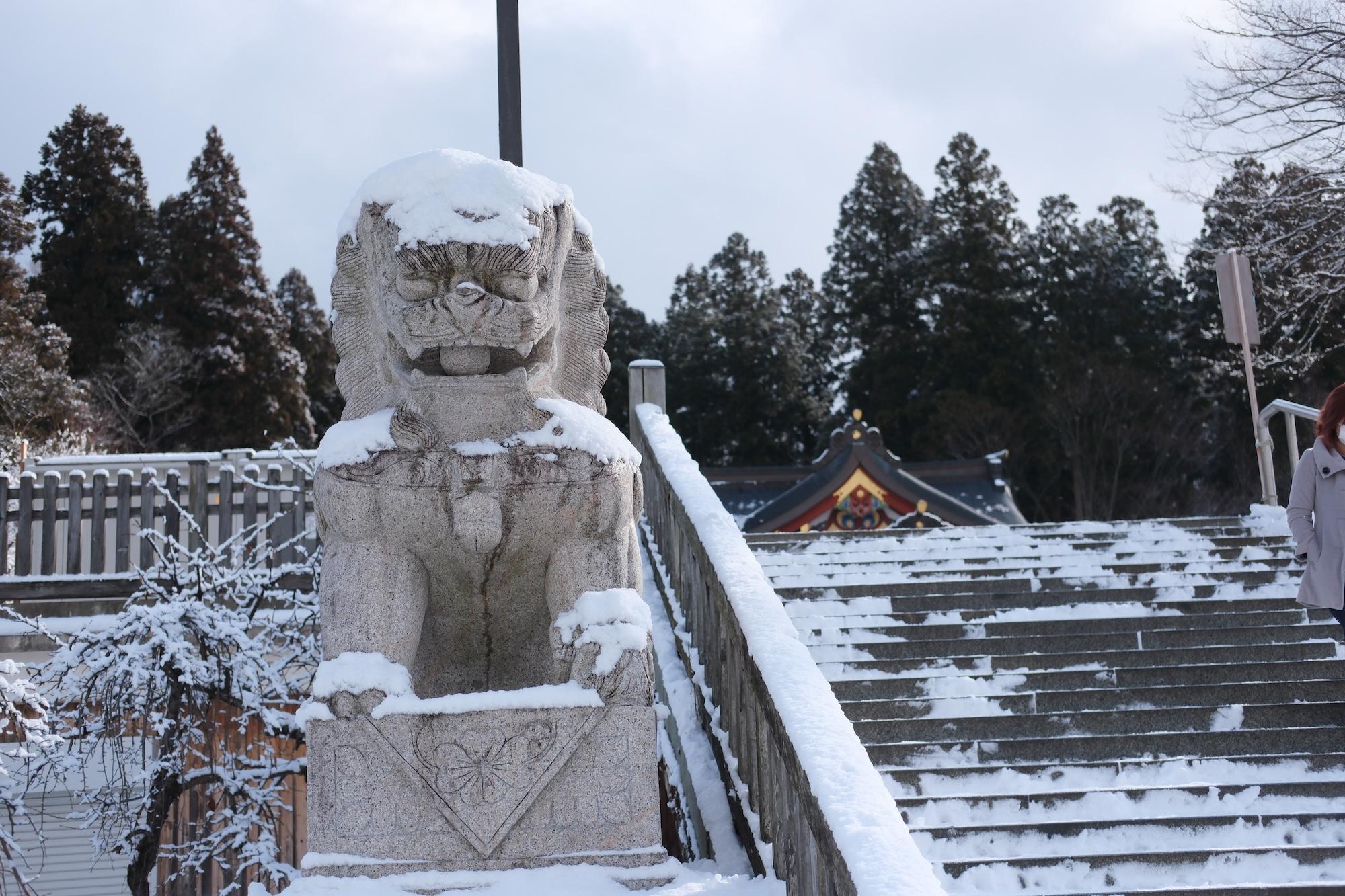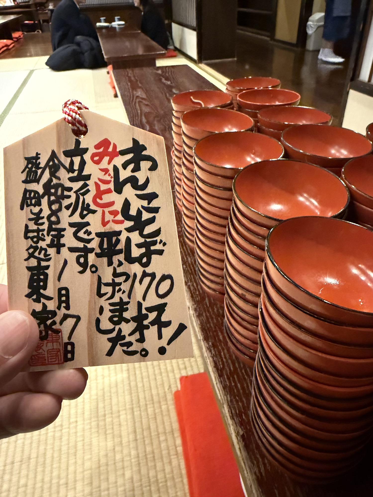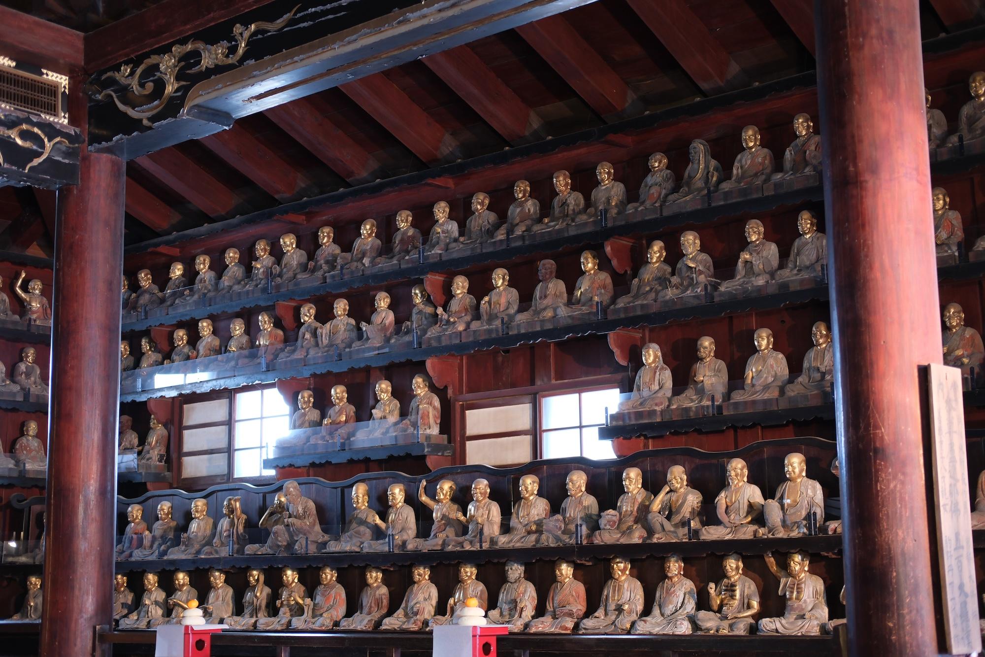 This setup is for wanko soba, one of Morioka's three signature noodles. The main attraction is soba, which is served in bite-sized bowls. I didn't know this going in, but it's a contest format where an attendant stands by you the entire time, chanting and refilling the bowl until you cry uncle. It's both a lot of food and a lot of entertainment.170 on my first attempt. It ain't much, but it's honest work. (I'm coming back for 200)Next day at the temple... Despite the freezing cold + snow, people still showed for hatsumode.This spicy ramen (actually spicy, not just Japanese spicy) was at a Chinese fusion sort of restaurant. Morioka seems to carry a lot of foreign influence -- e.g. two of their signature local noodles, reimen + jajamen, have distinctly Korean tones.Statues of 500 rakan (also translated arhat) at Hoonji.Contributing to the oyster shortage, part 2...